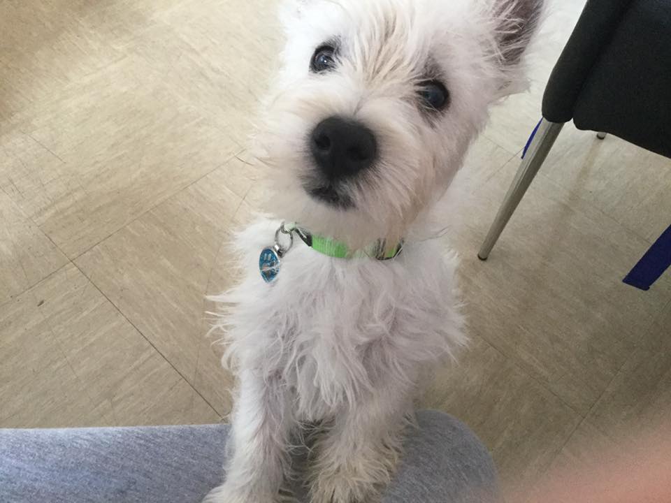 Jeffrey the Westie, wearing his new tag
