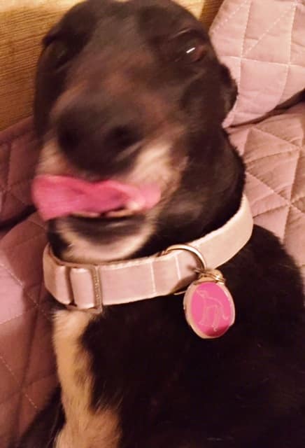 05 FebElsie Here’s Elsie, my 7-year old adopted ex-racing Greyhound showing how lip smackingly happy she is with her new forever home and her Tagiffany Tag; helping do her bit by giving a little something back to the RGT, as her way of saying “thank you” x HollieBella and Sam