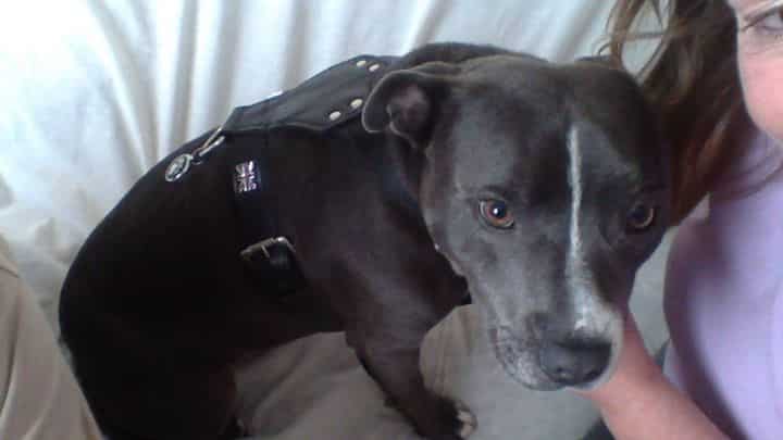 This is my bue staffordshire bull terrier Marley, sporting his new tag..