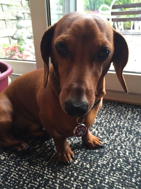 09 SepNutty Boom BoomPlease see attached pictures of Nutty Boom Boom, miniature male dachshund and CEO of his mum’s business, Nutty’s Knits & Pet Sits, wearing his stunning new tag. ChelseaScamper